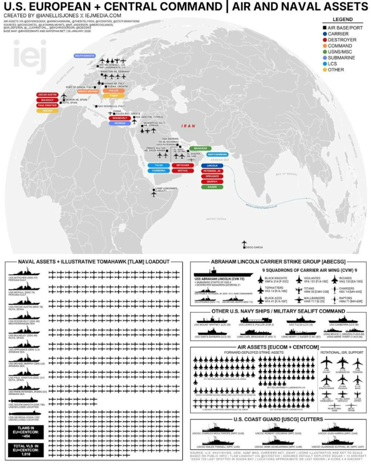 截至2026年1月26日,美国中东的军事力量部署。(X@IANELLISJONES)